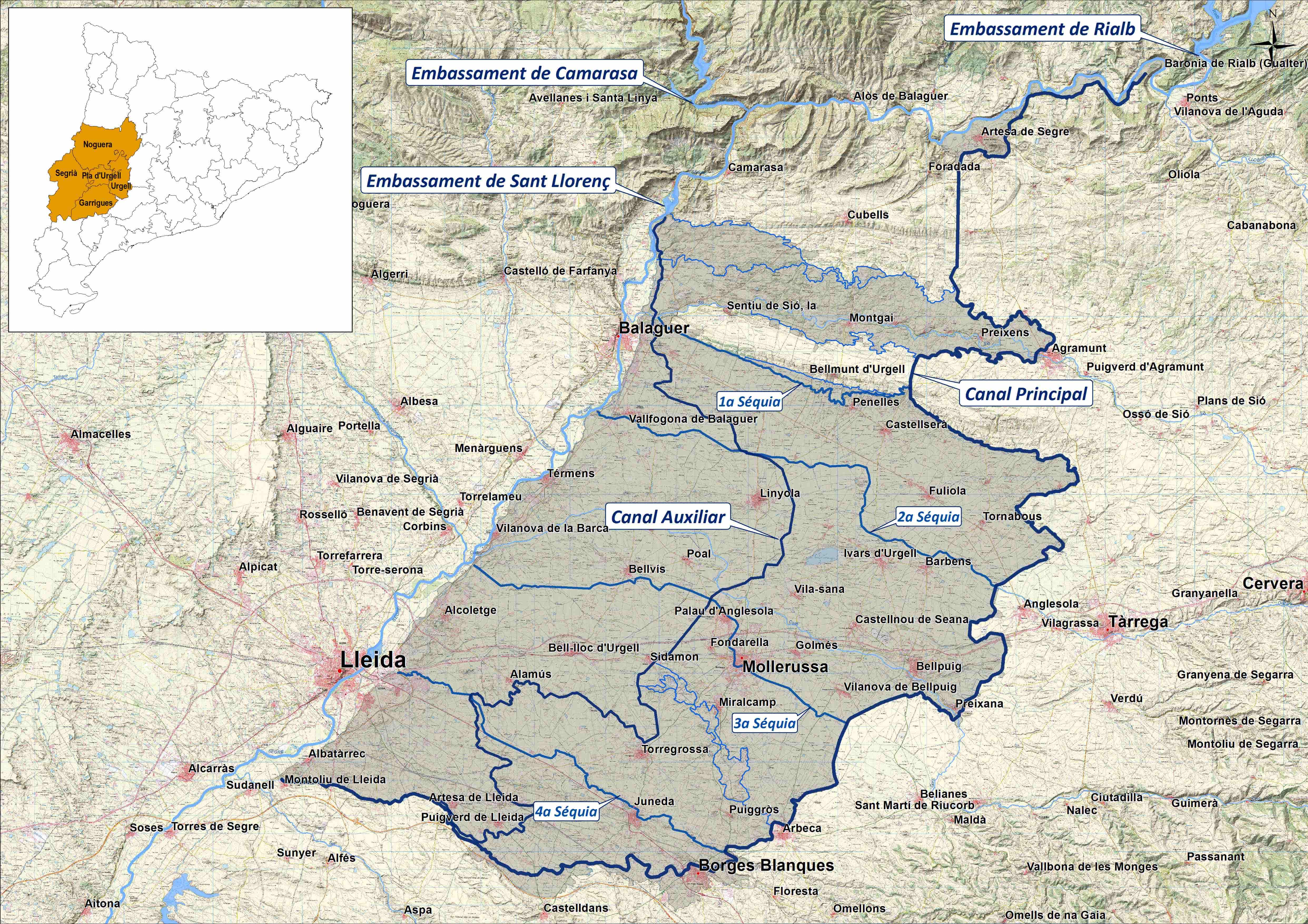 La superfície regable de la Comunitat General de Regants dels Canals d’Urgell (CGRCU), s’estructura en 21 col·lectivitats de regants amb aproximadament 18.000 regants i 48.600 parcel·les. S’abasteix des dels embassaments d’Oliana i Rialb, a la conca del Segre, i dels embassaments de Camarasa i Sant Llorenç de Montgai, a la conca del Noguera Pallaresa. El transport en alta es realitza a través de les dues infraestructures principals, el Canal Principal i l’Auxiliar, amb una longitud de 139 i 78 km respectivament, que transcorren de nord a sud pel territori, els quals van derivant l’aigua a una xarxa capil·lar de conduccions de més de 6.000 km de longitud que abasta a cadascuna de les parcel·les de l’àrea regable (Figura 2).