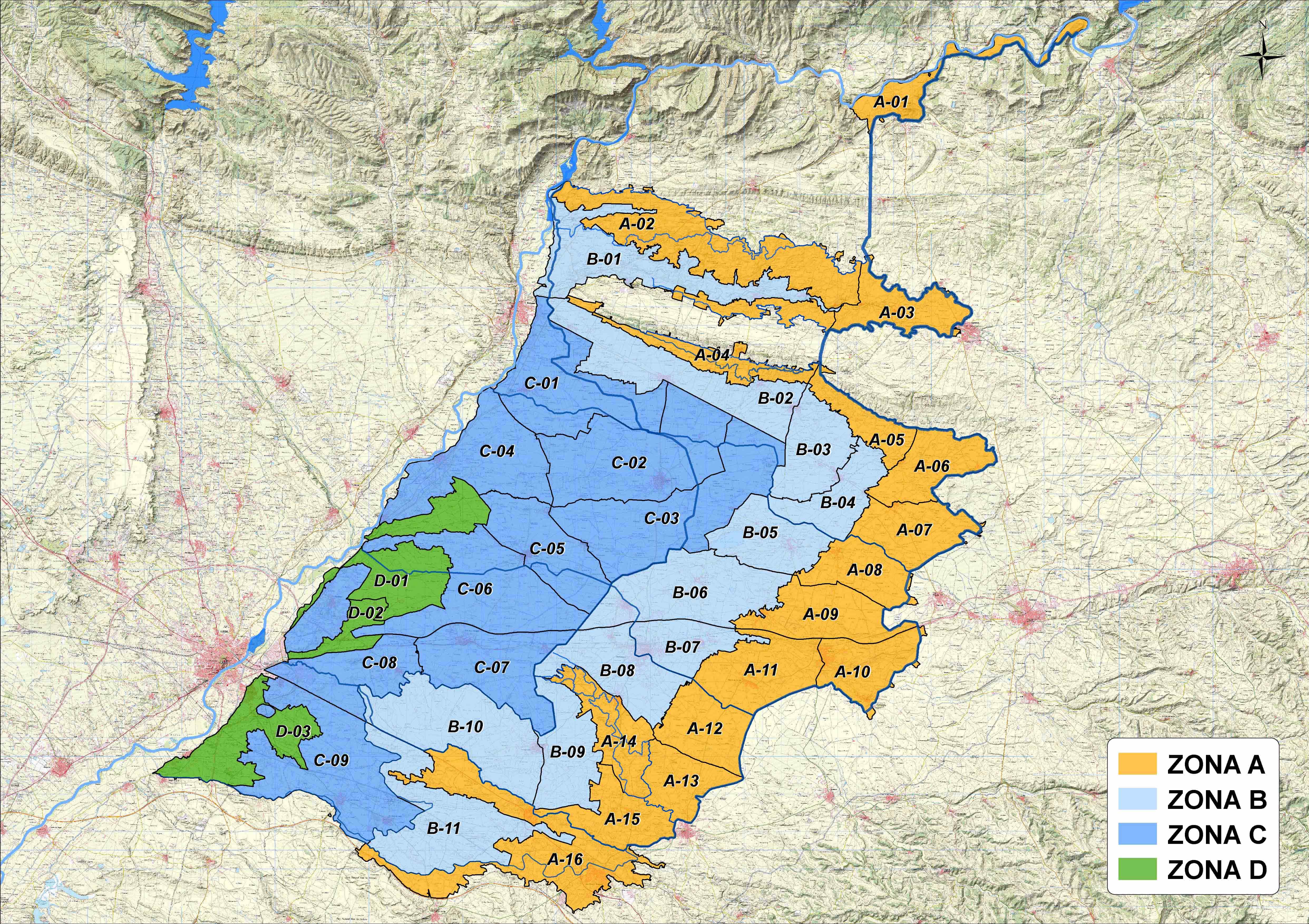 -Zona D: és la part més baixa de l’àrea regable i es pot regar per pressió natural des del Canal Auxiliar (4.083 ha).