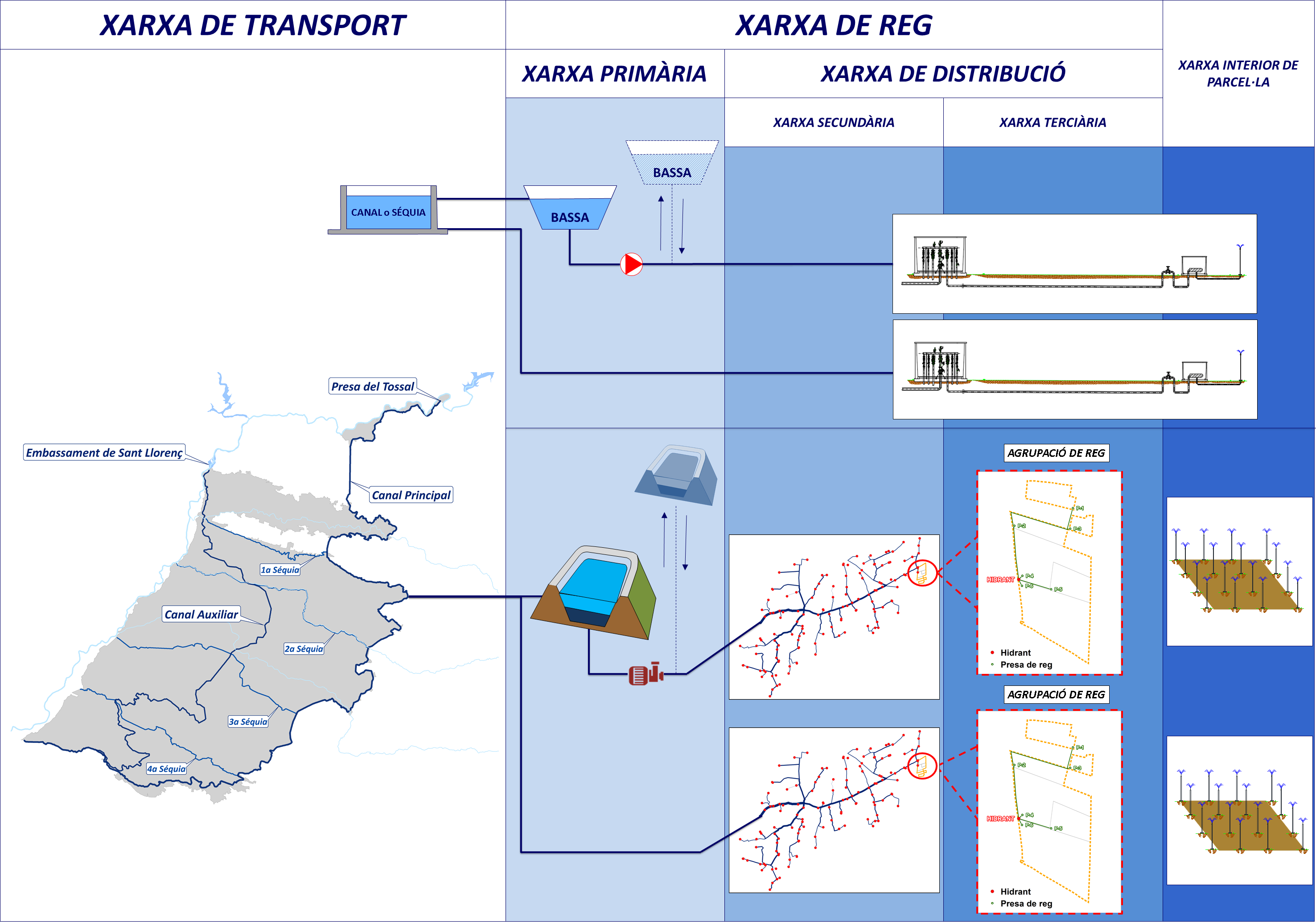 Mitjançant la Xarxa de Reg es transportarà l’aigua des de les diferents derivacions del canals principals fins a cadascuna de les explotacions de la CGRCU, amb les condicions de pressió i cabal necessaris que permetin instal·lar els sistemes de reg en parcel·la previstos, principalment reg per degoteig, reg per aspersió i pivots. En els Sectors de reg que requereixen bombament, s’impulsarà l’aigua a unes basses elevades i a partir d’elles es subministrarà l’aigua a les parcel·les, tal com es mostra a la Figura 4. A continuació es descriu els principals elements de la xarxa de reg.