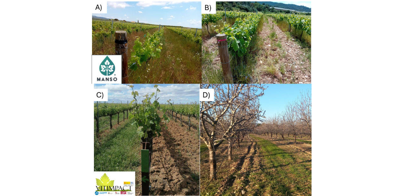 El projecte MANSO (Figura 1A i B), impulsat per INNOVI en col·laboració amb l’INCAVI, la Universitat Rovira i Virgili i empreses del sector vitivinícola del Penedès, pretén donar rigor científic sobre com gestionar el sòl, ja sigui mitjançant diferents tècniques de treball del sòl o coberta vegetal, en una zona altament afectada per la sequera, per minimitzar els efectes de les èpoques de sequera en els ceps. El projecte VITIMPACT combina diferents estratègies de reg, de maneig de capçada i de maneig del sòl (coberta verda o llaurat) a la zona de viticultura de regadiu de Raïmat (Figura 1C), per avaluar la interacció entre el maneig del sòl, el reg i el maneig de capçada en l’estat hídric, avaluant els components del rendiment de collita i la qualitat del most. D’altra banda, en el projecte RegenAlmond (Figura 1D) s’avalua la interacció entre el cultiu de l’ametller i la coberta verda pel que fa a relacions hídriques a la zona del Penedès, amb reg de suport.