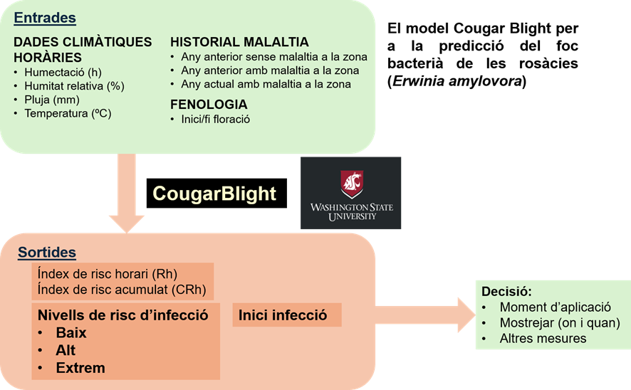 Figura 1. Esquema del funcionament del model Cougar Blight per a la predicció infeccions de foc bacterià (Erwinia amylovora) en pomera i perera.