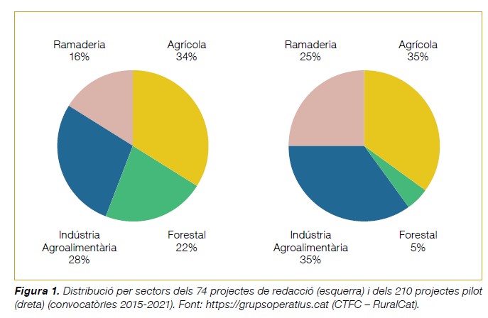 Quant a la redacció de projectes, el sector agrícola n’ha estat el sector més present, amb un 34% dels projectes aprovats, seguit per la indústria agroalimentària (28%), el sector forestal (22%) i, finalment, el sector ramader (16%).
