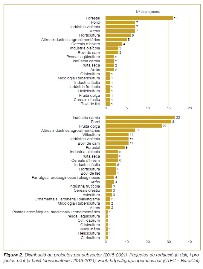 Tal com mostra la figura 2, els subsectors forestals són els més presents als projectes de redacció (22% dels projectes aprovats), seguits del subsector porcí (9%), la indústria vitivinícola (9%) i l’hortícola (8%). Respecte dels projectes pilot innovadors, el subsector de la indústria càrnia n’ha estat el més present (16% dels projectes aprovats), seguit del porcí (15%) i el de la fruita dolça (13%).