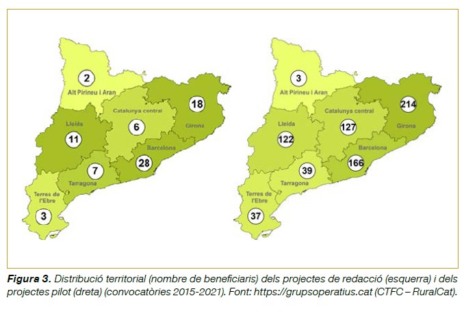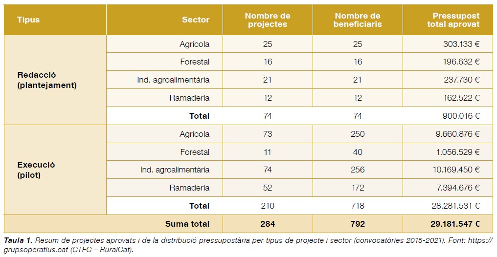 En el marc de l’anterior Programa de desenvolupament rural de Catalunya (PDR) 2014-2022, el Departament d’Acció Climàtica, Alimentació i Agenda Ru-ral (DACC) ha publicat sis convocatòries d’Ajuts a la Cooperació per a la Innovació entre els anys 2015 i 2021. Aquests ajuts, programats dins de l’operació 16.01.01 del PDR de Catalunya, comprenen dos tipus d’actuacions: d’una banda, la línia d’ajuts a la redacció de projectes de grups operatius de l’AEI-Agri (destinada a projectes que estan encara en una fase inicial i que requereixen un plantejament previ a la realització d’un pilotatge). D’altra banda, la línia d’ajuts a la realització de projectes pilot innovadors duts a terme pels grups operatius. Aquests ajuts estan cofinançats pel Fons Agrícola de Desenvolupament Rural (FEADER) en un 43%.