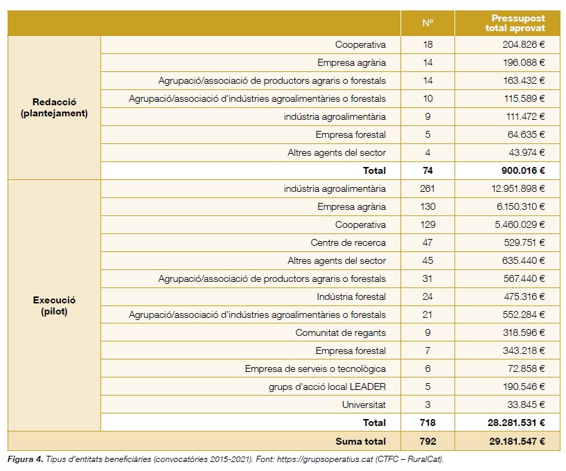 Tal com mostra la figura 4, les cooperatives lideren el nombre de beneficiaris de projectes de redacció, seguits de les empreses agràries i les associacions de productors agraris i forestals. En canvi, en la realització de projectes pilot són les indústries agroalimentàries les que se situen en primera posició, seguides de les empreses agràries i les cooperatives. De lluny, els segueixen els centres de recerca que han rebut ajut per a la coordinació dels projectes.