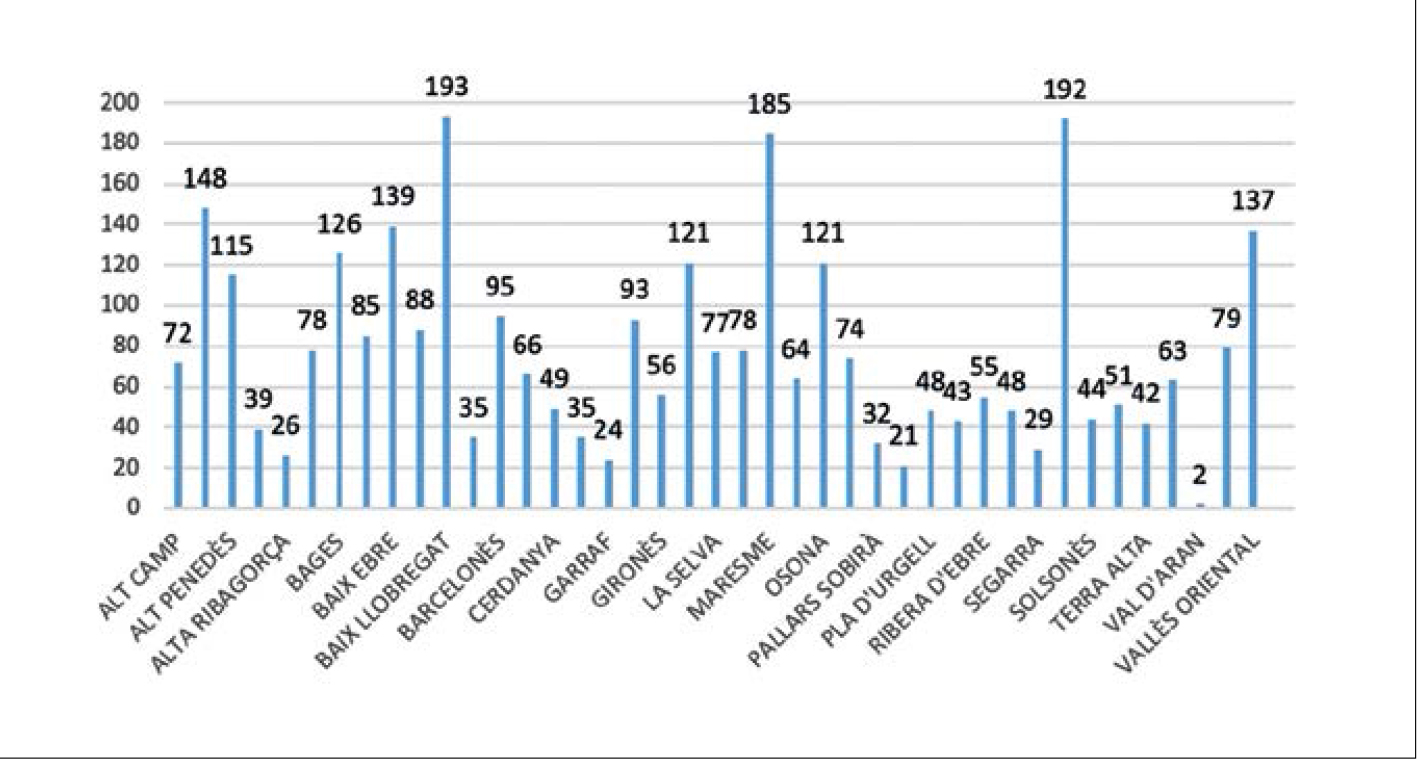 Productors adscrits per comarca (any 2020). Font: elaboració pròpia