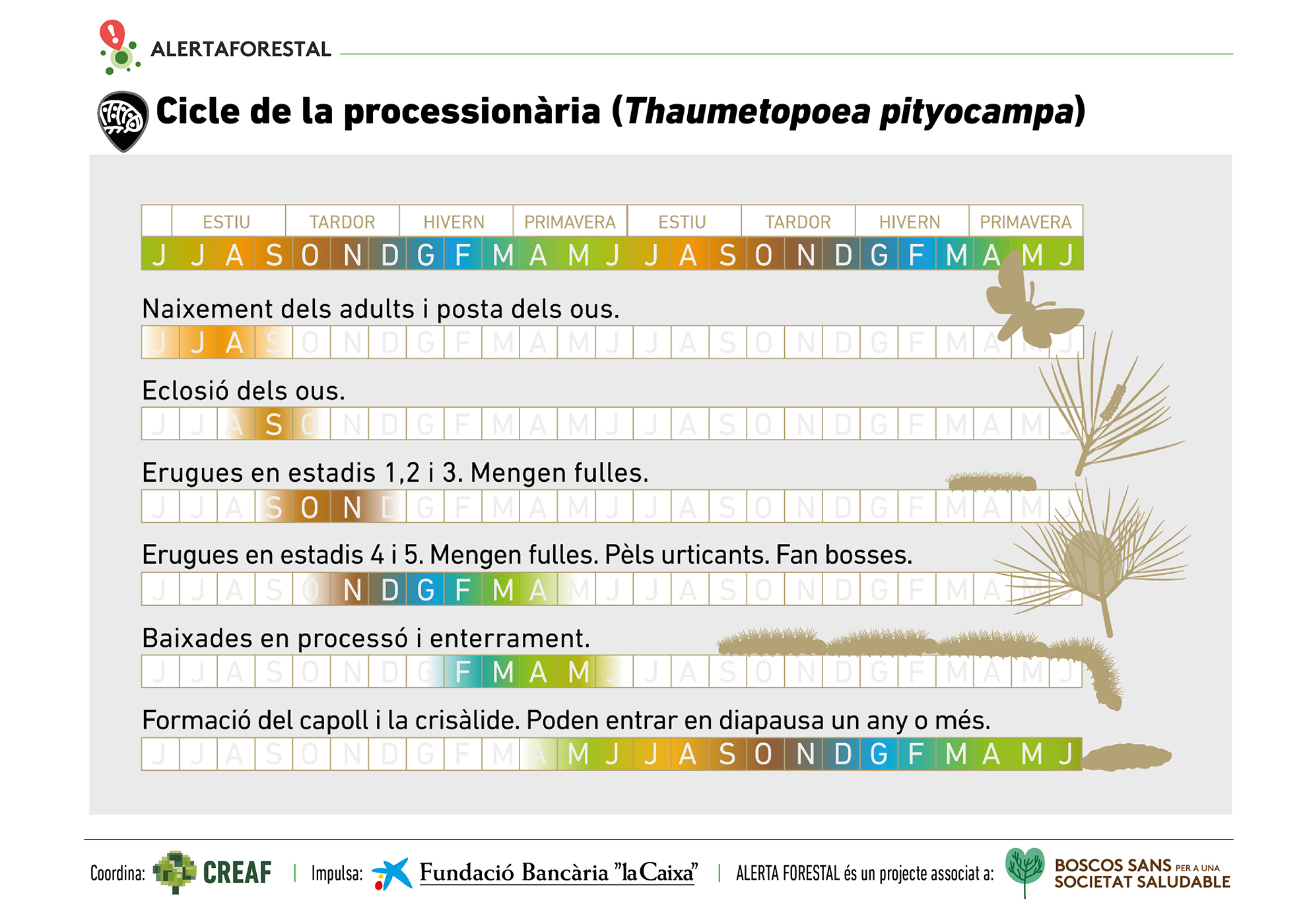 La processionària té un cicle vital complex i segueix la metamorfosis. Això vol dir que la papallona passa per diferents estadis, com totes les papallones. En primer lloc les erugues surten dels ous a la tardor i comencen a alimentar-se de forma massiva de les fulles dels pins. Quan arriba l’hivern amb les baixes temperatures que són letals per la processionària, comencem a veure el que semblen unes bosses fetes de teranyines blanques a dalt dels pins. Dins aquestes bosses s’hi refugien en grup les erugues per poder sobreviure el fred de l’hivern, i surten durant la nit per alimentar-se.