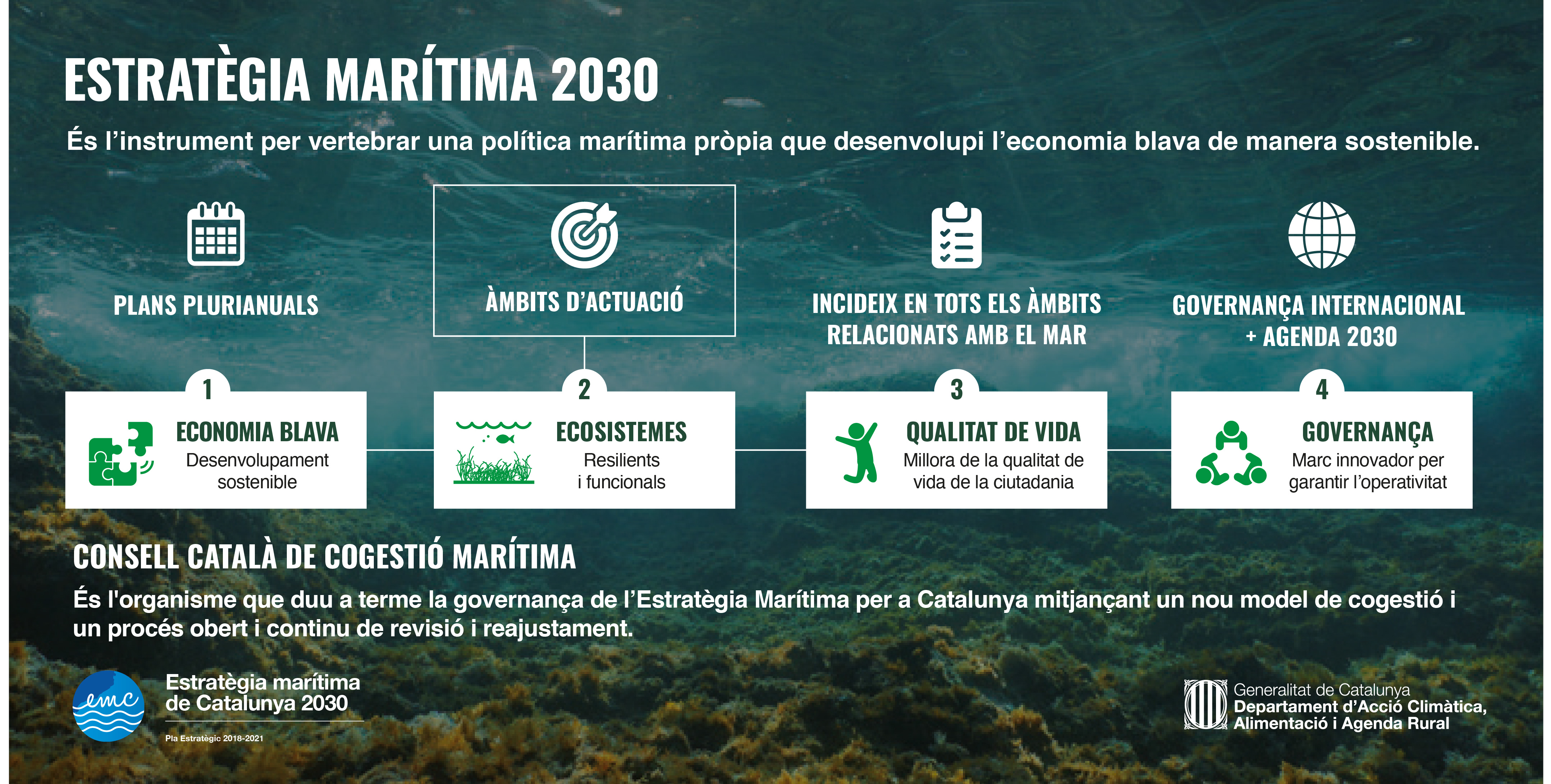 Des del mes de juny de 2018, Catalunya compta amb una Estratègia Marítima, una eina de país consensuada entre tots els departaments de la Generalitat que interpel·la el conjunt de la societat i posa les bases per a una política marítima pròpia. L’Estratègia té com a horitzó l’any 2030 i gira al voltant de quatre àmbits d’actuació: